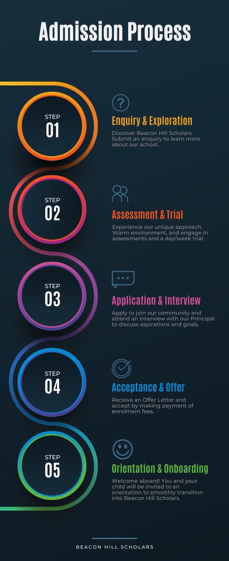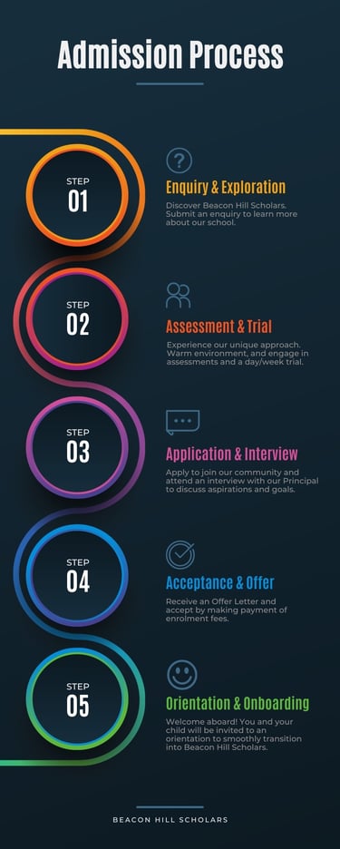 Begin your journey at Beacon Hill Scholars by expressing interest through our online inquiry form or giving us a call. Our admissions team will guide parents through the process, offering the chance to schedule a school visit. During the visit, students may undergo assessments in English and Maths, helping us determine their ideal year placement.